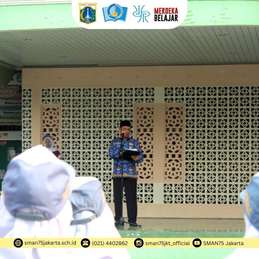 Kepala sekolah SMAN 75 Jakarta Drs. Ubaidillah, M.Pd. menjadi pembina upacara sekaligus membacakan pidato Menteri Sosial.
